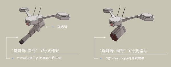 包括20毫米多管速射机炮(黑莓)、177毫米七通道火箭导弹发射巢(树莓)在内,提“蜘蛛蜂”飞行武器站的武器供凶猛的近距离爆发火力,高火力密度结合蜘蛛蜂的灵活性,以及前进轮换部署模式, 弥补了精度和可持续性的不足,非常适合为地面高机动轻装部队提供灵活而强有力、可随时调用的“随身武器库”直接火力支援。