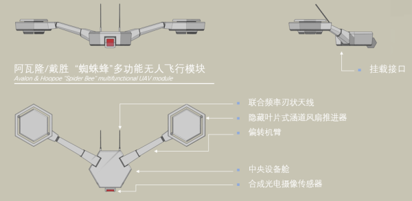 “蜘蛛蜂”中央设备舱后方配置有一个挂载接口,可吊挂多种模块化装备。除了常见的运输、侦查模块外,具有代表性的配置包括: